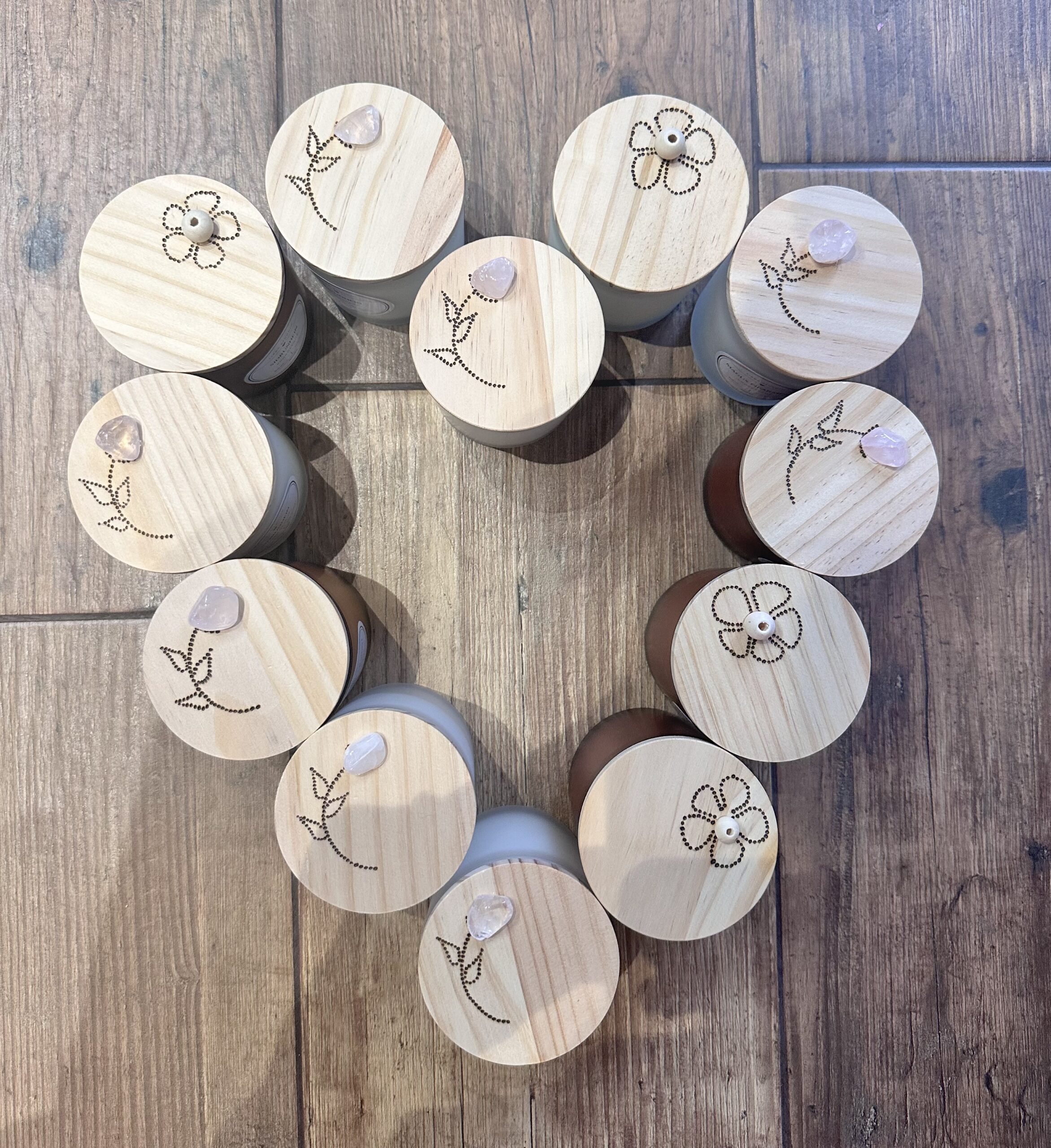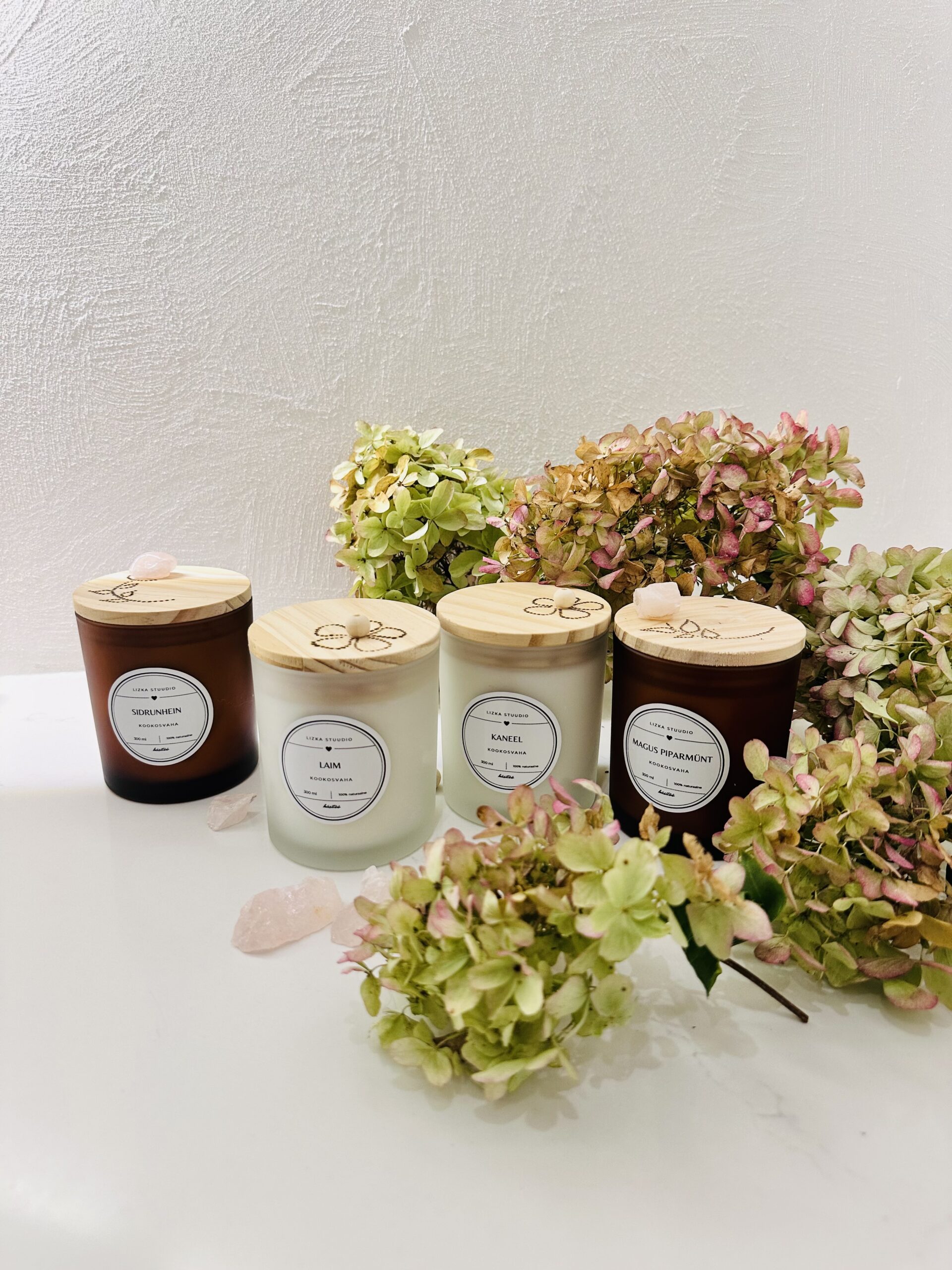 300 ml käsitöö kookosvahast lõhnaküünal “frosted” klaasanumas, mis on puidust kaanega millele olen ise käsitsi puidupõletajaga graveerinud lille. Kaasi on valikus kahte varianti disainiga: lill roosa kvartsiga ja lilleõis puidust pärliga.